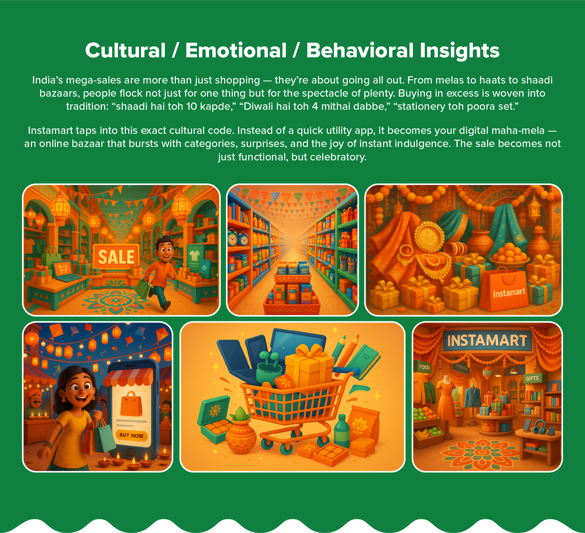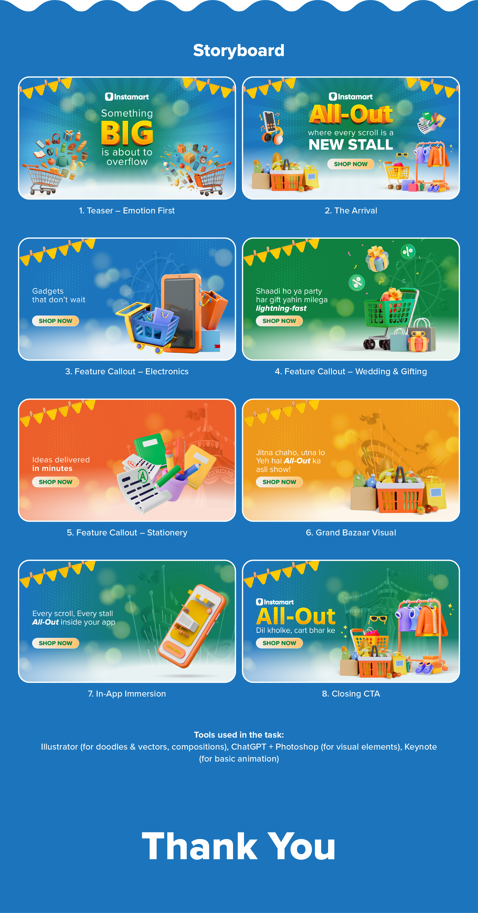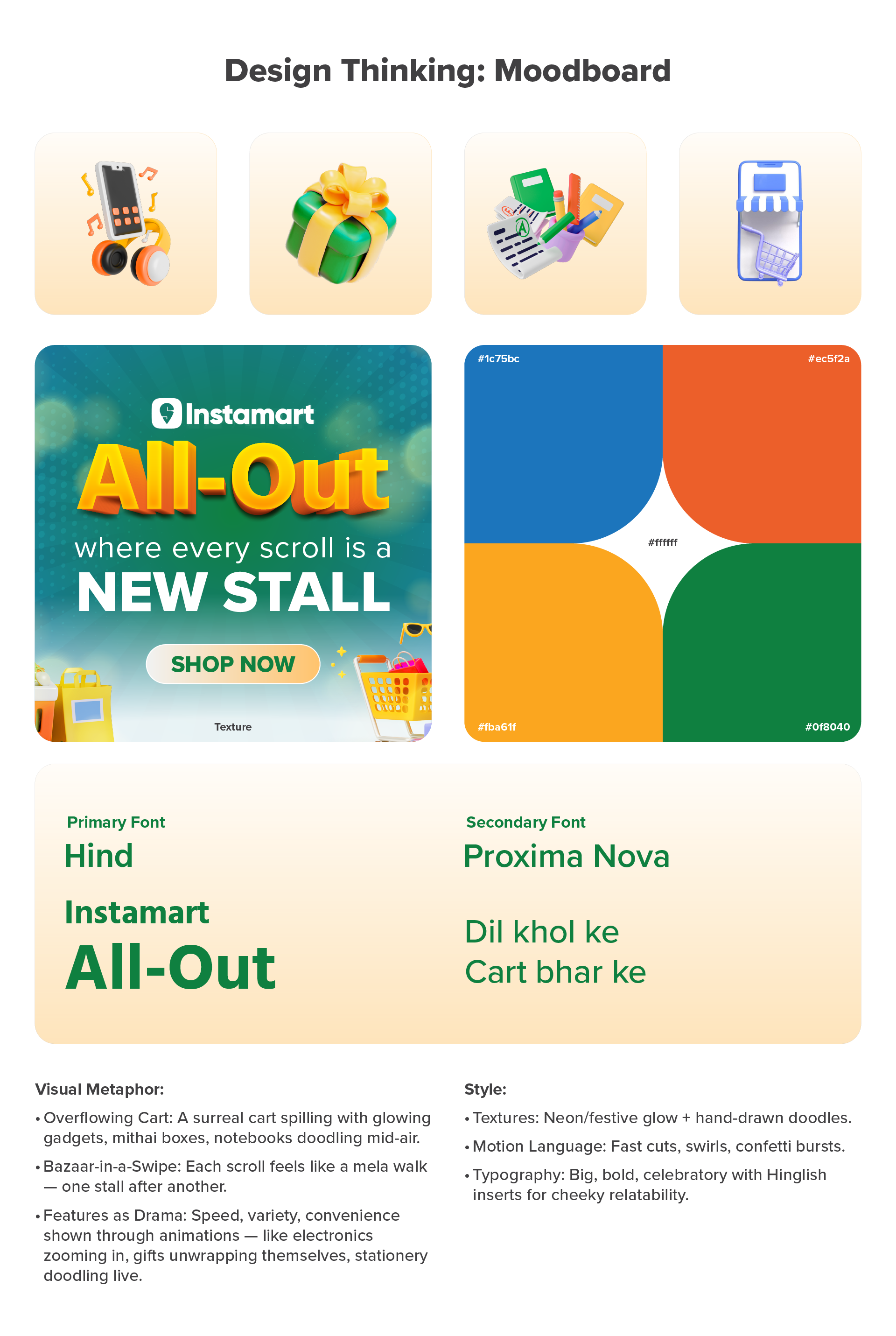 I created Instamart All-Out, a digital maha-mela that transforms the app into a vibrant festival of discovery. Drawing inspiration from the colorful chaos of Indian melas, the campaign brings each category to life — from glowing gadgets and doodling stationery to overflowing carts and festive motion. Playful Hinglish copy adds a dash of wit and warmth, making every scroll feel like exploring a stall and every tap a delightful surprise.