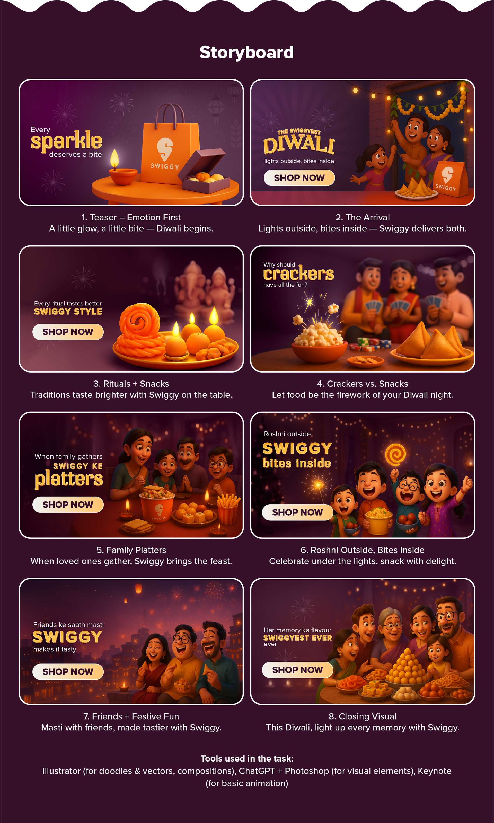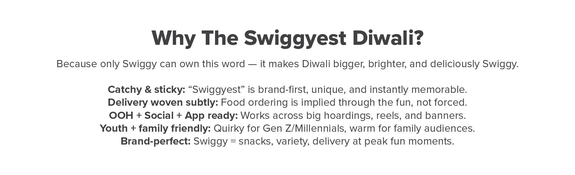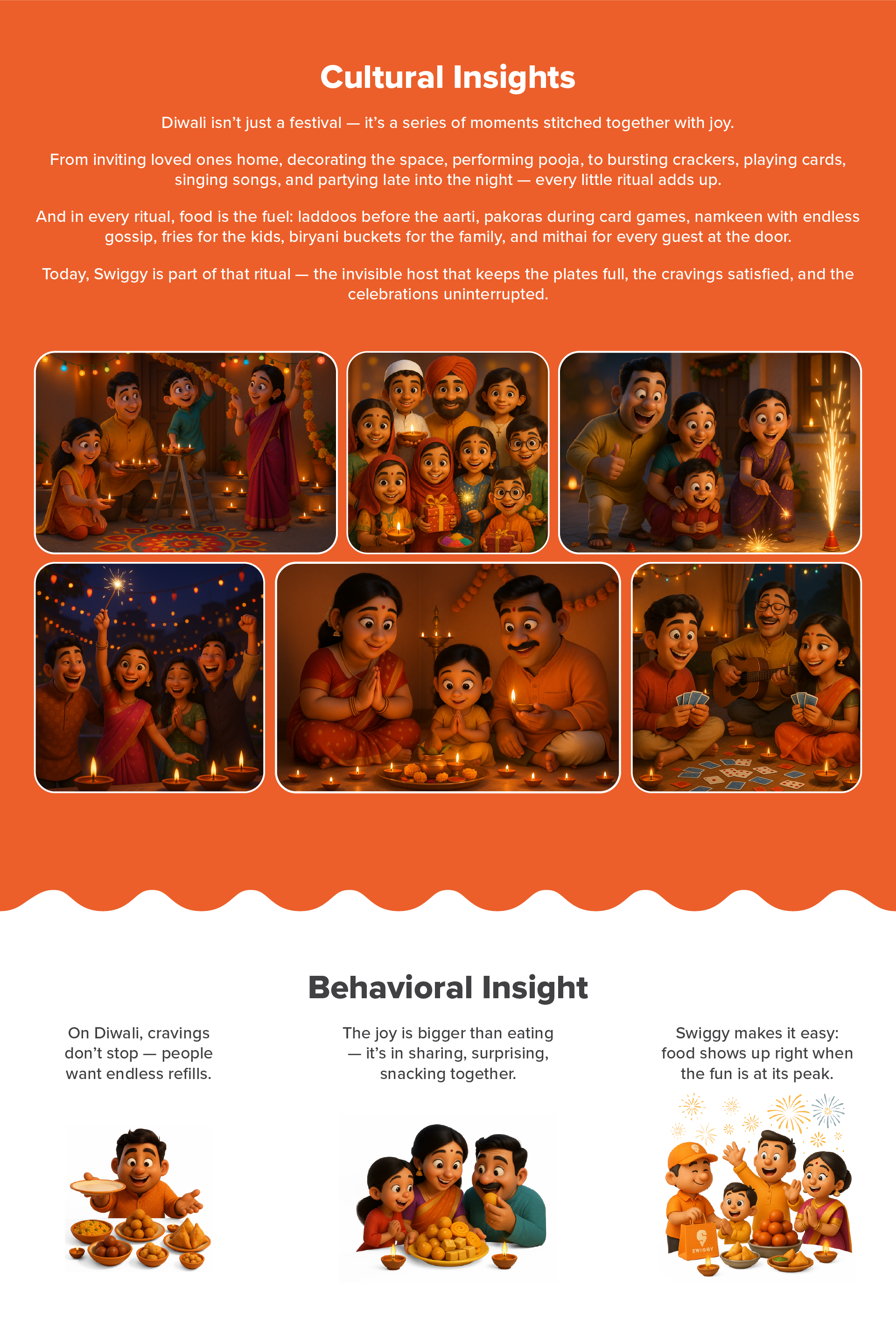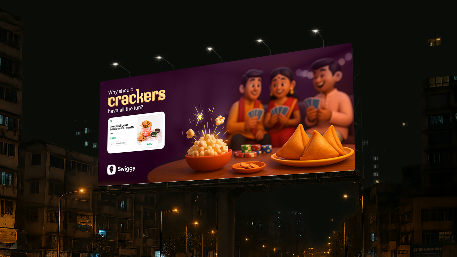 Built as a pan-India in-app + off-app thematic campaign, The Swiggyest Diwali transforms everyday festive moments — card games, bursting crackers, late-night gossip, and family reunions — into snack-worthy celebrations.